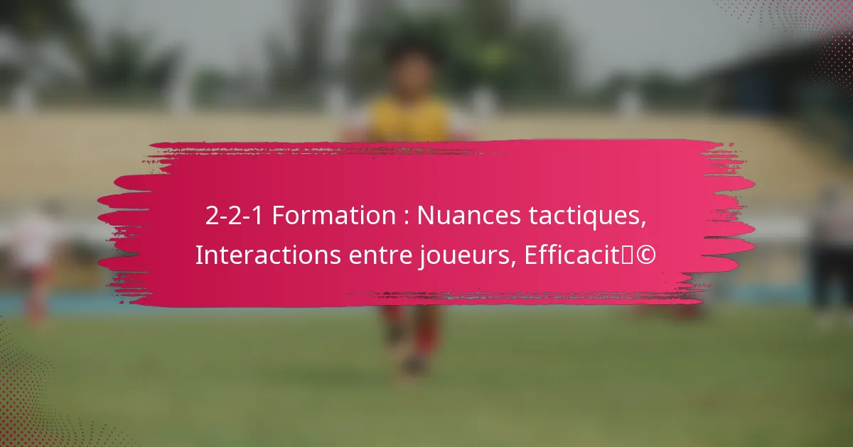 La formation 2-2-1 est un agencement tactique qui comprend deux défenseurs, deux milieux de terrain et un attaquant, conçu pour créer un équilibre entre la défense et l’attaque. Cette structure facilite non seulement un contrôle efficace du ballon et un jeu de transition, mais améliore également la gestion de l’espace, permettant aux équipes d’adapter leurs stratégies contre différents adversaires. Comprendre les rôles distincts et les interactions des joueurs au sein de cette formation est essentiel pour optimiser son efficacité dans divers scénarios de jeu.